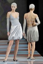 Разнообразие таких моделей можно увидеть, например, в коллекции певца женской элегантности Giorgio Armani. Черные бархатные или жемчужно-серые атласные платья с ажурными трикотажными вставками имеют длину где-то в районе колена, а значит, являются универсальными практически для любой праздничной вечеринки. В них нет нарочитой сексуальности очень узких, облегающих фигуру и выставляющих напоказ все ее достоинства нарядов. Нет никакой избыточности в декоре (в лучшем случае отделка мелкой и тонкой вышивкой серебристыми нитями или мелкими бусинками). Даже на обнаженной шее далеко не всегда есть скромные нитки бус или иных украшений.