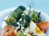 Выложите в салатник, украсьте веточками зелени и дольками вареного яйца.