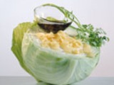 Из кочана вырезать кочерыжку, отварить его в подсоленной воде, разобрать на листья, срезать с них утолщения, уложить на них картофельный фарш, придав форму голубцов. Уложенные в форму голубцы залить соусом из сметаны, муки, соленой воды и запекать в духовке 10-15 минут, посыпав тертым сыром.