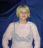 Это жилет понравился Ирине Авенировне, и она связала свой вариант. Для работы использовано 350 г пряжи синего и двух оттенков серого цвета. Вместо молодежного капюшона сделана овальная горловина, увеличена длина жилета, через дырочки сетки продет синий шнурок длиной 150 см, обозначивший место талии.