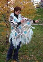 Летом иногда бывает прохладно. Нарядное ажурное пончо или шаль выручит прохладным вечером или пасмурным днем. Обсуждение вариантов Светлана сразу ограничила словом «пончо». Мы просмотрели много книг и журналов, выбрали несколько картинок, просмотрели мешок с запасами, отобрали подходящую пряжу, еще раз помучились выбором и остановились на модели из журнала 1985 года – белое пончо, собранное из 15 квадратов и 1 треугольника.