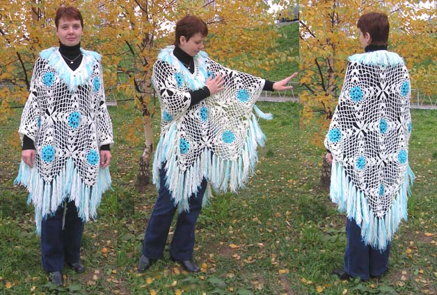 Пончо украшено кистями, на изготовление которых ушли все оставшиеся нити. На горловине кисти длиной 10 см из 4 синих и 10 светлых нитей длиной 20 см прикреплены к столбикам сетки. По низу пончо обвязано одним общим рядом дуг из 11 в.п, к которому прикреплены кисти длиной 20 см из 10 светлых и 3 синих нитей длиной 40 см. Справа и слева от линии плеча половинки квадрата обвязаны вместо дуг из 11 в.п. столбиками с 2Н (имитация манжеты), кисть прикреплена сразу на две дуги, замыкая отверстие для руки.