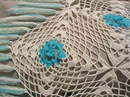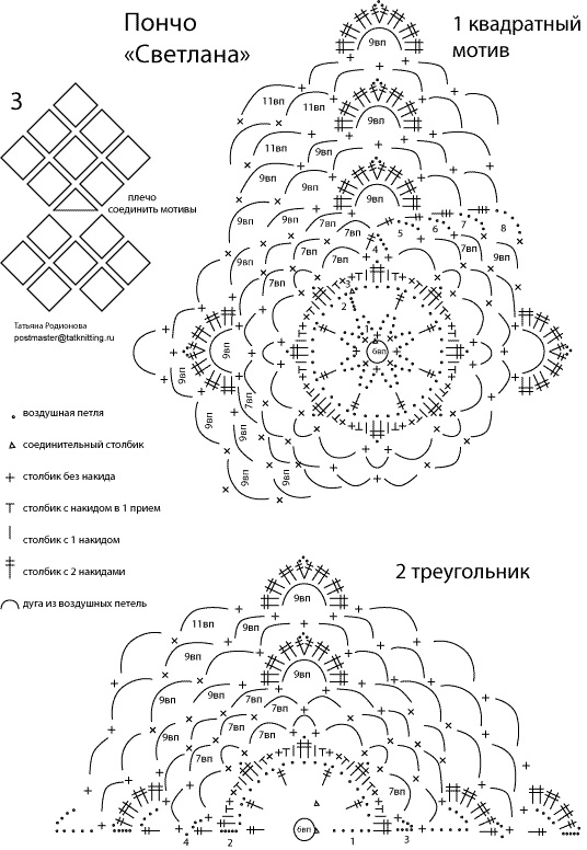 По схеме 1 (3 ряда) связано 15 синих цветков и по схеме 2 (2 ряда) - 1 половинка цветка. Серединки обвязаны по схеме 1 светлой нитью (ряды 4-12), в рядах 4-6 дуги по 7 в.п., в рядах 7-9 – по 9 в.п., 10-12 – по 11 в.п., уголки во всех блоках одинаковые (на дуге из 9 в.п. вязать 7 ст. с 2Н, 3 в.п. 7 ст. с 2Н). Сторона получившегося квадрата равна 21 см. При использовании нитей другой толщины легко получить квадрат нужного размера, недовязав или добавив несколько рядов светлой нити. 15 квадратных мотивов соединены по схеме 3 во время выполнения цепочек последнего ряда, вместо средней в.п. дуги вязать 1 ст. б/н на дуге присоединяемого мотива. В горловину со стороны спинки ввязан треугольник. Горловина обвязана 1 рядом ст. б/н, 1 рядом сетки (ст. с 1Н, 2 в.п.) и еще 5 рядов ст. б/н. В уголках делать убавления, пропуская 2 ст. б/н.