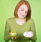 4. Постепенно в рацион вместо мяса вводить нежирную рыбу, побольше есть клетчатки, которая содержится в яблоках, капусте, петрушке. При этом начинать прием пищи нужно именно с этих продуктов. Дело в том, что клетчатка в желудочно-кишечном тракте азбухает и мешает усваиваться углеводам, в результате чего организм получает меньше калорий. Соблюдая такую последовательность, можно похудеть, даже не меняя рациона.