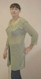 Для длинного жакета, размер 50, потребовалось 600 г нитей «Хлопок каскад метанит», 57% хлопок, 36% вискоза, 7% метанит, 330 м / 100 г, для отделки использован «Хлопок мерсеризованный», 100% хлопок, 220 м / 50 г (московская фабрика «Камтекс»), крючок 2,5. После начала работы выяснилось, что мерцающие нити оказались двух оттенков, поэтому полочки, спинка и рукава связаны из более темной нити (ее оказалось больше), а воротник и отделочная кайма – из более светлой. Кроме того, мерцающая нить размывает границы узора, для более четкой формы отделочных кружев и края жакета использован одноцветный хлопок (израсходована половина мотка в 50 г).