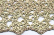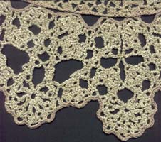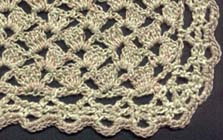 Связать по схеме 2 отделочное кружево для рукава длиной 34 см (обязательно целое число узоров, длина кружева - от 32 до 37 см), замкнуть его в кольцо при вязании последнего витка тесьмы. Обвязать 1 рядом столбиков без накида отделочной нитью низ кружева для рукава, наложить его на низ рукава и пришить.
