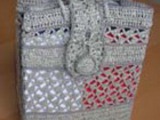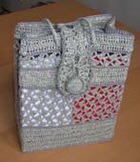 Пришить пуговицы к сумке. Используя рисунок воротника жакета, связать застежку, ширину тесьмы можно увеличить до 4-5 столбиков. Сделать в пакете около углов еще 4 отверстия. Надеть сумку на пакет и скрепить их вместе, продев шнур в отверстия для ручек и новые отверстия. Сшить шнур в кольцо.
