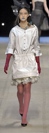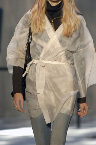 Здесь нельзя не вспомнить о популярных некогда в нашей стране (да и в Европе) коротких широких плащиках из шуршащей болоньи или прозрачного пластика. Сегодняшние модели – это в чем-то отголоски именно тех тенденций шестидесятых годов, когда синтетика еще только начала вторгаться в мир Высокой моды.