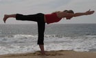 5. Из предыдущего положения на выдохе подняться на правой ноге таким образом, чтобы сомкнутые руки и левая нога были параллельны полу, а правая нога полностью выпрямлена. Силуэт напоминает букву Т.