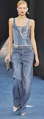 Впрочем, если вы не готовы сразу к таким подвигам во имя джинсовки, то присмотрите себе какие-то более традиционные вещи из денима. У Chanel в этом сезоне можно найти классические джинсовые тренчкоты, жакеты, пиджаки, шорты, юбки, замечательные комбинезоны, сумки. Есть и чудесные пляжные мини-сарафанчики на тонких бретелях, и классические прямые брюки, и брюки-бананы, которые расширяются на бедрах и сужаются к щиколоткам. Многим должен понравиться и комплект из открытого джинсового топа в форме мужской майки и широких объемных брюк с отворотами.