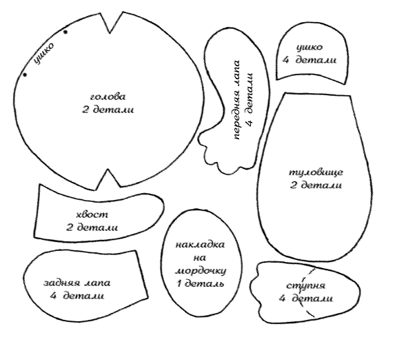- Стачать передние лапы, оставив открытые отверстия в местах, отмеченных на выкройке штрихами. Лапы вывернуть, набить наполнителем. Отверстия зашить потайным швом. Лапы прикрепить к туловищу в местах, отмеченных на выкройке (способ подвижного соединения подробно описан на странице «Подвижные лапы»)
