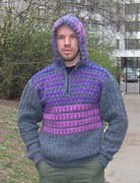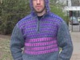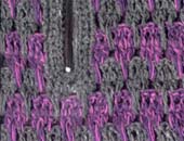 Для изготовления этой куртки потребовалось 600 г шерстяной нити домашнего прядения цвета асфальта (150 м / 100 г), по 100 г сиреневой и темно-сиреневой шерстяной пряжи (400 м / 100 г), крючок 3,0 и спицы 2,0, молния длиной 15 см.