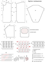 В полотне куртки использованы 5 узоров для крючка: основной узор - схема 1, чередование 3 столбиков с 1 накидом и 1 рельефного столбика с 2Н (низ переда/спинки и рукава), схема 2 - чередование 2-х рядов цвета асфальта и 2-х цветных рядов (перед и капюшон), столбики без накида – обвязка застежки и капюшона,