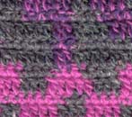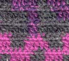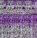 Перед. Наметить на выкройке расположение (ширину) цветных полос. Набрать цепочку длиной 52 см (число петель обязательно нечетное), связать на ней 1 ряд столбиками с 1 накидом, отметить средний столбик и каждый 4-й справа и слева от него, т.е. отметить места рельефных столбиков 2-го ряда. Далее вязать основным узором по схеме 1 одноцветную полосу намеченной высоты (17 см), затем той же нитью цвета асфальта связать еще два ряда (1а и 2а) по схеме 2, воздушные петли узора 2 провязывать между рельефными столбиками узора 1. Далее вязать узор по схеме 2 (13 см – цветные ряды сиреневая нить в 3 сложения, 13 см - нить из 2-х темно-сиреневых и одной сиреневой, остальное – 3 темно-сиреневых нити), выполняя по 2 ряда основной (1а, 2а, 5а, 6а) и по 2 ряда (3б, 4б, 7б, 8б) цветной нитью, согласно цветной разрисовке переда. Получится узор из вертикальных полос, в котором серые вертикали продолжают линию рельефных столбиков нижней части. На высоте 32 см разделить полотно на 2 части и довязывать каждую половину отдельно, оставив разрез шириной 4 см (5 столбиков) для застежки. Вывязать по выкройке горловину и скос плеча. Набрать по нижнему краю детали на спицы 2,0 петли (из каждой петли цепочки – одну петлю резинки) и связать, чередуя 1 лицевую и 1 изнаночную петлю, 5 см резинки.