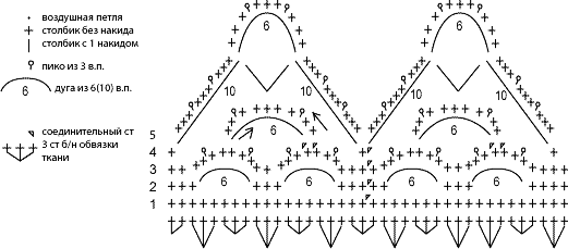 4-й ряд: 1 ст б/н на столбиках 3-го ряда, дуга из 10 в.п., 1ст с 1Н на ст б/н 3-го ряда, дуга из 6 в.п., 1ст с 1Н в то же место, что и предыдущий, дуга из 10 в.п., 1 ст б/н и т.д.