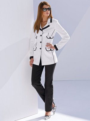 Какая современная деловая женщина сможет обойтись без модного, элегантного, стильного пиджака? Двухцветный пиджак с четырьмя пуговицами будет эффектно смотреться не только с брюками, но и с юбкой. Очень кстати окажется ремень в тон пиджаку.