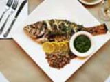 Потребуется 800 г морского окуня, 500 г помидоров, 50 г муки, 100 г растительного масла, 50 г зелени петрушки, 50 г овечьего сыра, 20 г панировочных сухарей, чеснок, черный молотый перец, соль по вкусу.