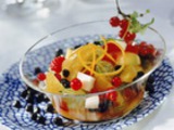 Замечательный десертный салат, несмотря на свое название, включает в себя и бахчевые овощи (дыню и тыкву) в сыром виде.
