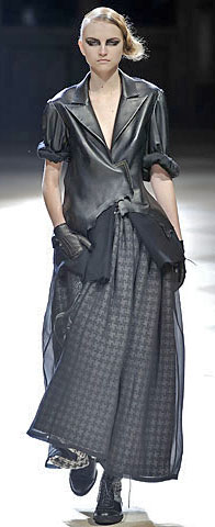 Кстати, именно такие жакеты в первую очередь замечательно смотрятся в комплекте с вещами из легкого тонкого шифона, прозрачного газа или шелка. Сочетание брутальной тяжелой кожи и невесомого легкого шифона – это вообще очень любопытная и интересная тенденция нынешнего сезона. И один из вариантов такого сочетания – прозрачная блузка из черного шелка и черная кожаная юбка.