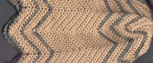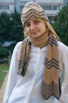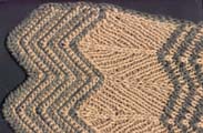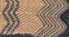 Далее провязать 10 см песочной нитью, выполняя на краях и в середине убавления, а между ними прибавки. Затем связать двухцветную полоску из 10 рядов и т.д., симметрично началу шарфа.