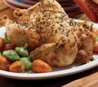 Разогреть духовку до 190 градусов. Соединить масло, петрушку и паприку. Втереть эту массу в курицу по всей поверхности. Порезать апельсин пополам и положить внутрь. Положить курицу в форму грудкой вниз, смазать оставшимся маринадом и запекать 20 минут. Перевернуть курицу и запекать 1 час 10 минут, поливая каждые 15-20 минут выделяющимся соком. Курица готова, когда из нее течет чистый сок, если воткнуть палочку в середину. Подавать курицу с выделившимся соком.