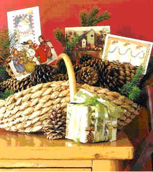 Очень красивые и органичные подставки для хвойных композиций получаются из корзинок. Если корзинка очень глубокая, то сначала заполните ее наполовину старыми газетами, прикройте сверху красивой тканью или бумагой, а поверх выложите ветви, шишки и другой природный материал, несколько елочных шаров или свечей. В каждом доме найдется множество старых новогодних открыток, которые также можно использовать для создания композиций. Сосновые шишки служат отличными подставками для открыток, при необходимости можно сделать в них дополнительные прорези.