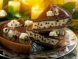 Взбить до загустения сливки с несколькими каплями ванильной эссенции. Полить сливками пирог сверху и с боков и украсить его половинками лесного ореха.