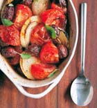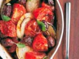 Потребуется 600 г баранины, 8 картофелин, 4 репчатые луковицы, 4 небольших баклажана, 3 ст. ложки томата-пюре, 2 стакана бульона, 4 помидора, 100 г курдючного сала, 4 зубчика чеснока. Кроме того, зелень петруки, кинзы, лавровый лист, соль и черный молотый перец по вкусу.