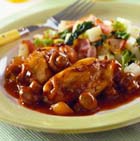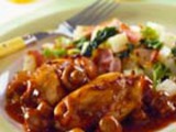 Потребуется 600-700 г мяса кролика, 3-4 репчатые луковицы, 2 ст. ложки оливкового масла, 1/2 стакана белого сухого вина, 100 г не очень острого кетчупа или томатного соуса, 1-2 зубчика чеснока, веточки свежего тимьяна или базилика, черный молотый перец, соль по вкусу.