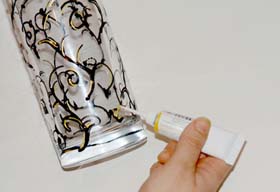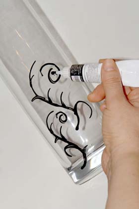 Старайтесь надавливать на тюбик контура равномерно, тогда получатся красивые линии. Если же полоски выходят разной толщины, не огорчайтесь, это можно исправить рисунком. Например, из каждого утолщения проводите новую линию или маленькие штришки, и у вас получится непредсказуемая импровизация. Если не решаетесь рисовать сразу на вазе, сделайте предварительный эскиз рисунка, сверните его в трубочку и вложите в вазу, закрепив скотчем. По нему будет гораздо проще работать.