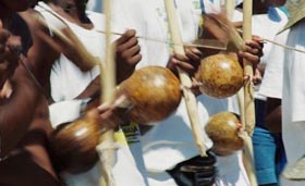 Рода – круг по-португальски. Участники собираются в круг, во главе которого стоит старейший или самый опытный игрок. Он играет на главном инструменте – беримбао, который имеет важное значение, и отношение к нему соответствующее. По сути, это тыква, через которую натянута тетива. Оркестр помогают создавать и другие инструменты – барабаны, пандейро (бубен). Поют исключительно на португальском. Песни о лучших игроках и просто случаях из жизни.