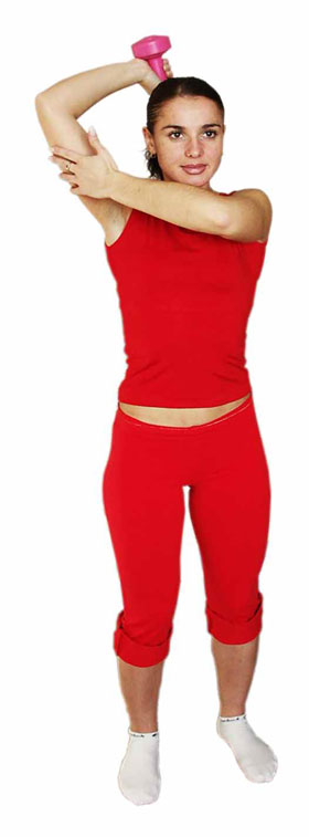 Поднимите правую руку с гантелью вверх, держа ее как можно ближе к голове; кисть всё время должна быть направлена ладонью вперёд. Левой рукой придерживайте правый локоть (фото 1).