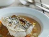 Отварить филе рыбы. Молодую морковь, корень петрушки и сельдерея, молодую свеколку и лук нарезать соломкой, положить в сотейник. Добавить сливочное масло, рыбный бульон и тушить 15-20 минут. Зеленый салат, щавель и шпинат тщательно вымыть, положить в дуршлаг, обдать кипятком, а затем нарезать соломкой.