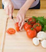 Мясистые помидоры средней величины разрезать на 4-6 долек. Из перца вырезать семена, нарезать его кусочками размером 1х2 или 2х2 см.