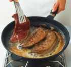 Подготовленную печень нарезать на широкие порционные куски, посыпать их солью, перцем, запанировать в пшеничной муке и слегка обжарить с обеих сторон на животном жире. Печень положить в горячий соус и довести до готовности при температуре не выше 80-85 градусов. Для этого поставить посуду с печенью на водяную баню или в духовку. Если в рецептах указывается определенный вид печени, это совсем не значит, что таким образом нельзя приготовить и другой вид. Смело проводите эксперименты и готовьте понравившееся блюдо.