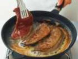 С телячьих почек, если они очень жирные, срезать жир, оставив его слоем не более 10 мм. Разрезать почки поперек на ломти толщиной 10—12 мм. Свиные почки разрезать вдоль пополам. Почки посыпать солью, перцем и жарить на сковороде с жиром, поворачивая ломтики с одной стороны на другую. У готовых почек не должно быть красноты на разрезе, но не следует также жарить их слишком долго: пережаренные почки не сочны.
