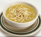 Чтобы суп был прозрачным, лапшу перед варкой необходимо просеять и ошпарить кипятком, откинуть на сито и дать стечь воде. Готовый суп подать с кусочком вареной курицы, посыпав мелко нарезанной зеленью.