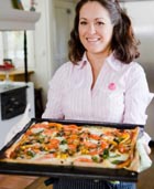 Когда тесто увеличится примерно в 2 раза, разогреть духовку до 210-220 градусов. Тесто раскатать и выложить в форму для пиццы или на сковороду. Смазать соусом. На одну четверть положить измельчённые помидоры, на вторую - фарш с луком, на третью - шампиньоны с чесноком, на четвёртую - солёные огурцы с укропом. Посыпать пиццу сыром. Дать немного подойти и поставить в духовку примерно на 20-25 минут.