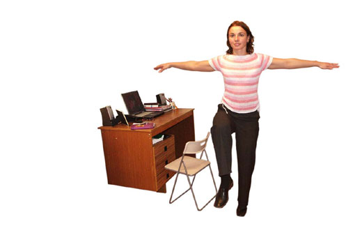 Стоя на одной ноге, сгибаем свободную ногу в коленном и тазобедренном суставе под углом 90 градусов и поднимаем так, чтобы бедро было параллельно полу. Одновременно поднимаем прямые руки в стороны. Подбородок стараемся на грудь не опускать. Мышцы спины и живота напряжены (фото 1).