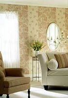 Попробуйте изменить традиции наклеивать обои сплошным пространством, скомбинировав два вида обоев. В данном случае два вида обоев одного оттенка, но с разным цветочным дизайном создают интересный эффект полосок. Чтобы избежать излишней пестроты, лучше наклеивать один вид обоев цельной полосой, а второй – только в половину ширины.