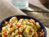 Вынуть кастрюлю из духовки. Отложить в сторону 6 креветок и 6 гребешков. Остальные морепродукты смешайте с рисом. Разложите оставленные креветки и гребешки сверху, запекайте, не закрывая крышкой, еще 20 минут или до тех пор, пока не впитается вся жидкость.