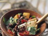 Потребуется: 700 г куриной грудки,650 г стручковой фасоли, 650 г кабачка, 1 красный сладкий перец,4 помидора в собственном соку (можно больше), 200 мл. сока от этих помидоров, 2 больших зубчика чеснока, 1 пучок укропа, 3 луковички шалот. Кроме того, ½ стручка свежего жгучего перца, лавровый лист, соль и черный молотый перец по вкусу.