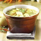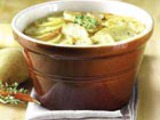Потребуется: 1,5 кг говяжьей печени, 1 литр говяжьего бульона, ½ стакана растительного масла, 8 картофелин, 4 репчатые луковицы, 2 соленых огурца, зелень петрушки и соль по вкусу.