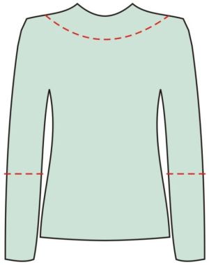 1. Обрезаем старую кофточку по рисунку: делаем больше вырез горловины и отрезаем рукава на 3 см ниже локтя. Красным пунктиром на рисунке обозначены линии отреза.