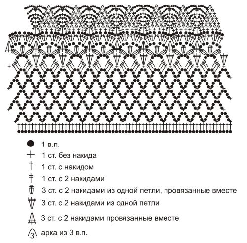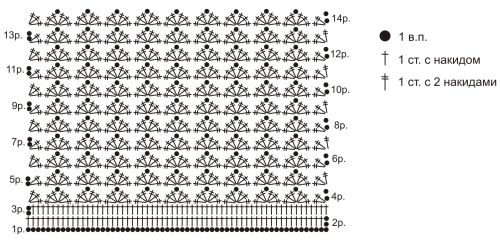 Б) 1-й ряд вяжем столбиками с 1 накидом, 2-й и все последующие ряды - по схеме: