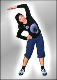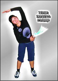 Одна рука на поясе, другая согнута в локте (фото 3), сделайте наклон корпусом и потяните руку через голову (фото 4). Вернитесь в исходное положение, повторите до 30 раз. Чувствуйте натяжение боковых мышц.