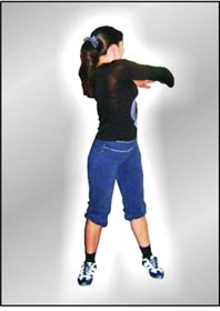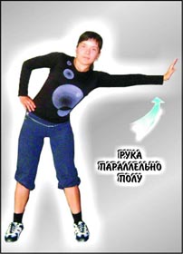 Рабочую руку выставляем параллельно полу, ладонь вертикально (фото 5), другая рука по-прежнему на поясе. Потянитесь в сторону вытянутой руки, смещая корпус параллельно полу, затем сделайте обратное движение в противоположную сторону. Представьте себе, как движется печатная машинка – ее основание остается неподвижным, а верхняя часть двигается в стороны. По этому же принципу передвигайте корпус вправо-влево, чтобы в общей сложности получилось 30 повторений.