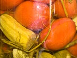 Помидоры (лучше некрупные, одинакового размера) вымыть и надрезать крестиком со стороны плодоножки. Залить кипятком на 3 минуты, затем сразу же окунуть в холодную воду. Снять кожицу.