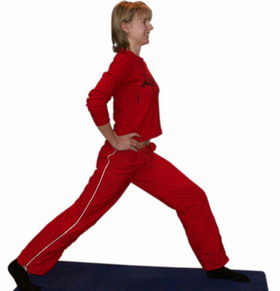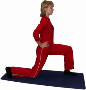 Встаньте, ноги на ширине плеч, стопы параллельно, руки на поясе, спина и живот напряжены. Правой ногой сделайте широкий шаг назад настолько далеко, чтобы потом, опускаясь на колено, Вы могли зафиксировать прямой угол между голенью и бедром как правой, так и левой ноги (Фото 1).