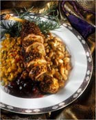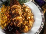 300 г куриного филе отбить, посыпать специями или натереть соусом «Чили». Затем на пластину филе положить измельченное яблоко (лучше антоновку). Завернуть яблоки в филе, перевязать ниткой – и на 10-15 минут отправить в аэрогриль.